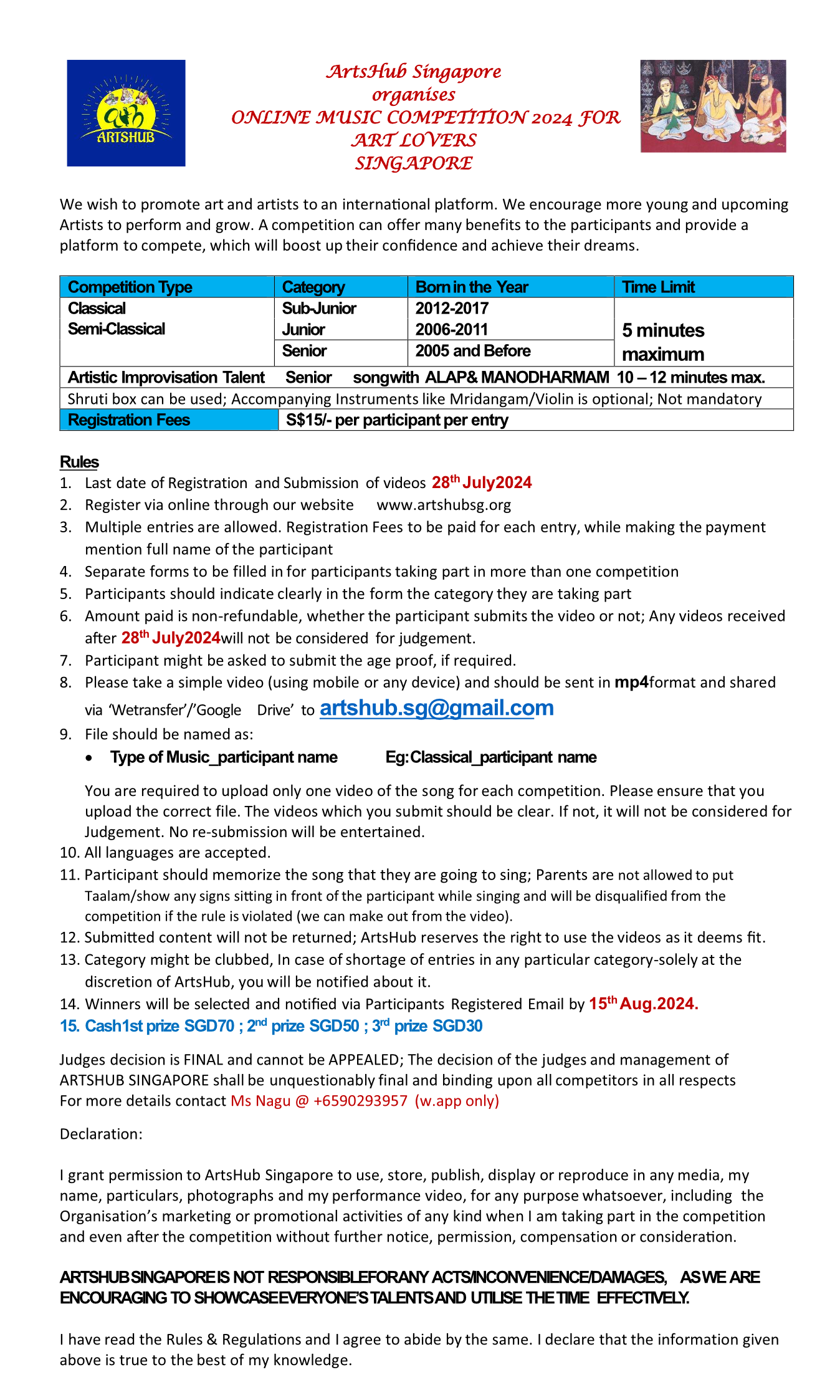 For more details contact : artshub.sg@gmail.com . Phone : +6590293957